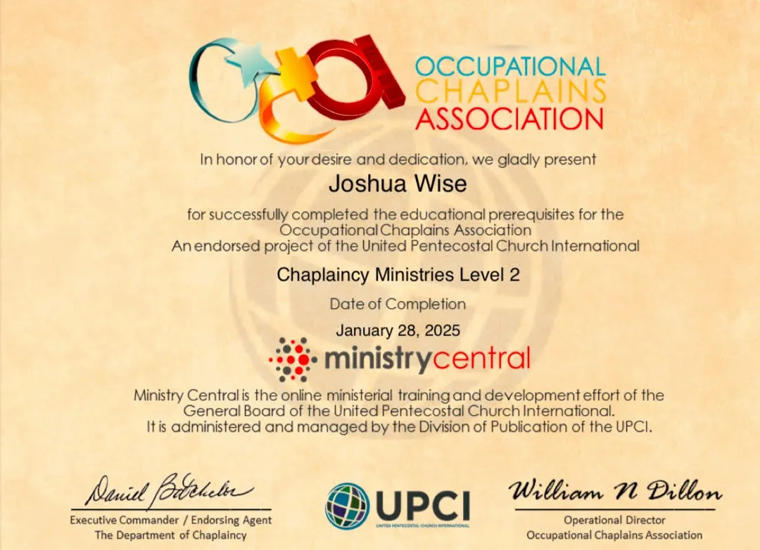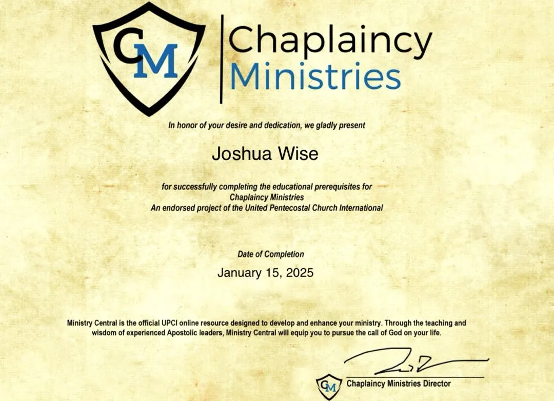 In addition to pastoring, Josh has worked professionally as a job recruiter and HR specialist, and has served as a hospice chaplain. These roles inspired him to expand his ministry and become a credentialed independent chaplain. His mission is to serve the local community by providing chaplaincy services to healthcare facilities and corporate workplaces—creating safe, supportive environments for both residents and employees.